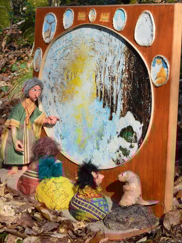Huile sur bois, céramique, verre 55x41x12 cm
